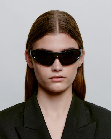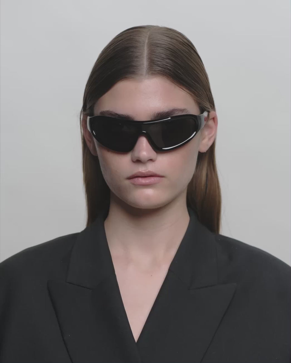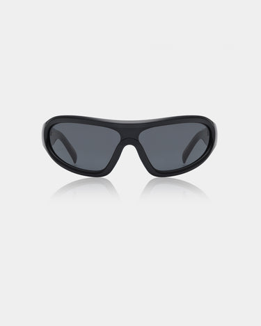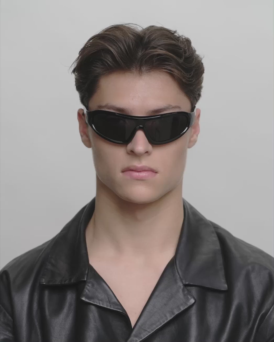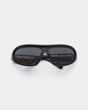 Devon - Black är en distinkt wraparound-modell med en sportig retrolook. Den svängda designen följer ansiktet och kombinerar mode och funktion. Ett statement-solglasögon för aktiva dagar och en urban vardagslook.
